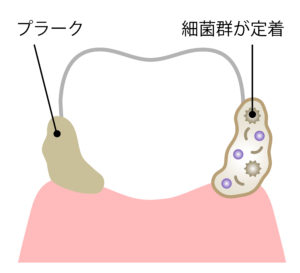 プラークは、お口の中の食べかすや磨き残しなどの汚れをもとに、歯周病菌などの細菌がねばねばした物質を作り出して、歯の表面にくっつきます。