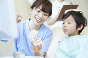 このような不安をやわらげるためには、治療前に器具や装置を見せながら説明することで、歯科医院の環境に慣れてもらう配慮が大切です。