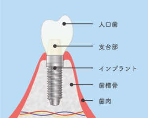 インプラントの治療では、土台であるインプラント体を歯ぐきに埋入しますが、埋入されたインプラント体はやがて顎の骨と結合することで、高い安定性を得ます。